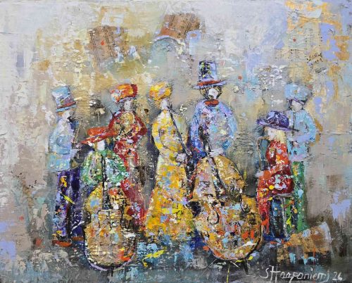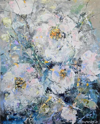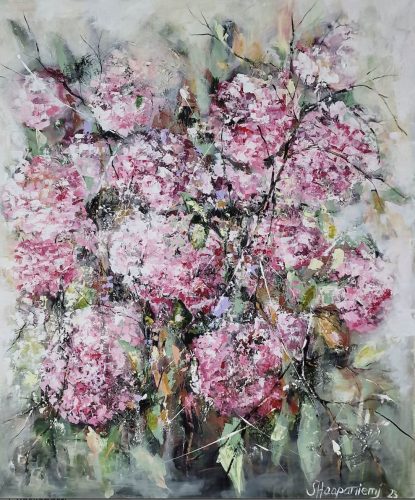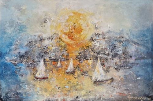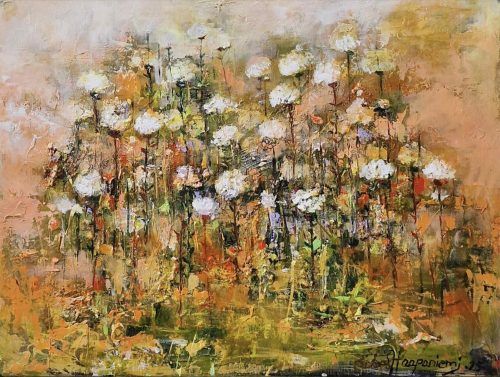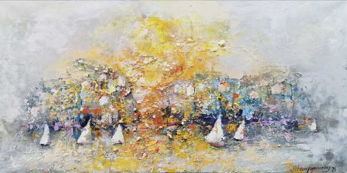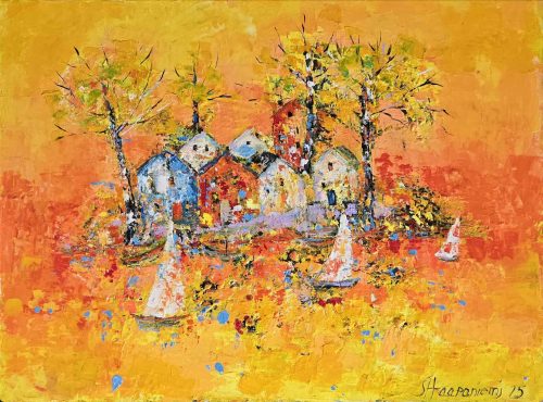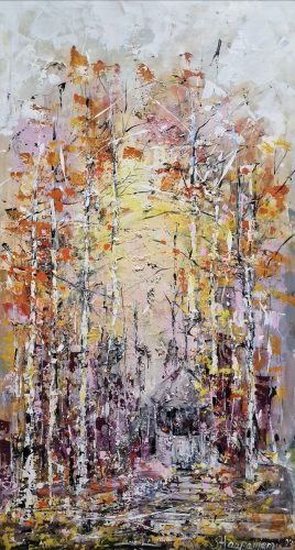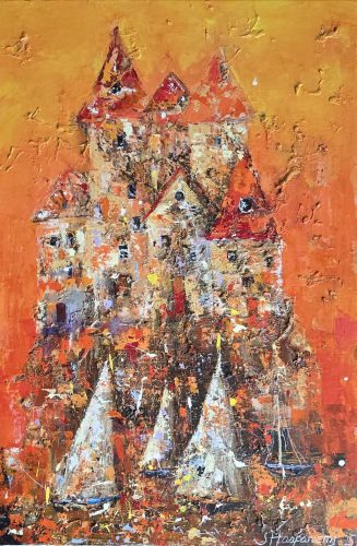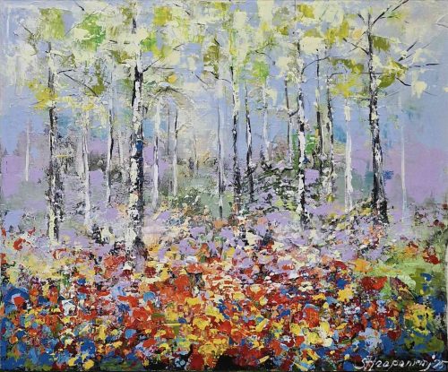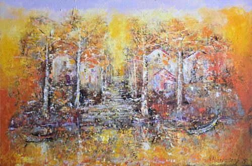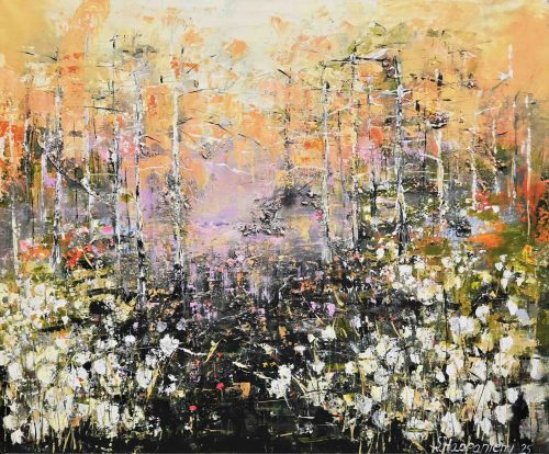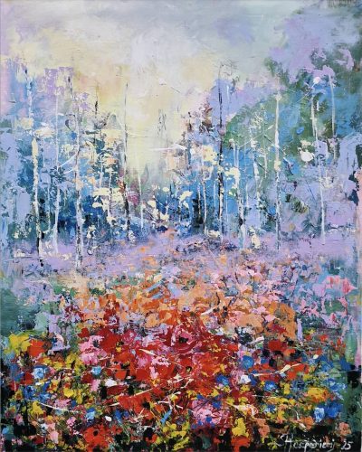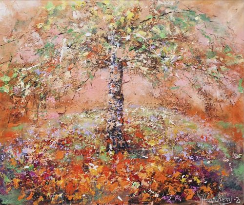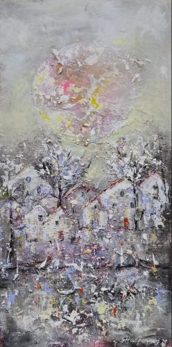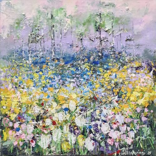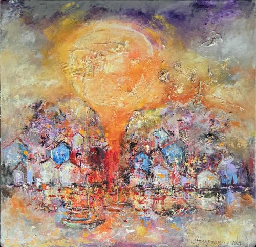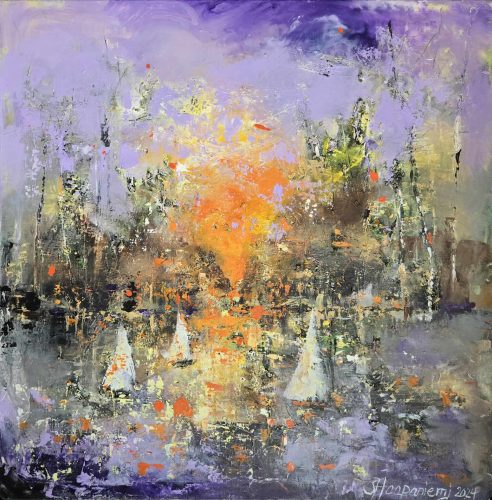 By several layers and brave, lively use of colours she wakes the surface of canvas to live – the changing of lightning arises new, different details